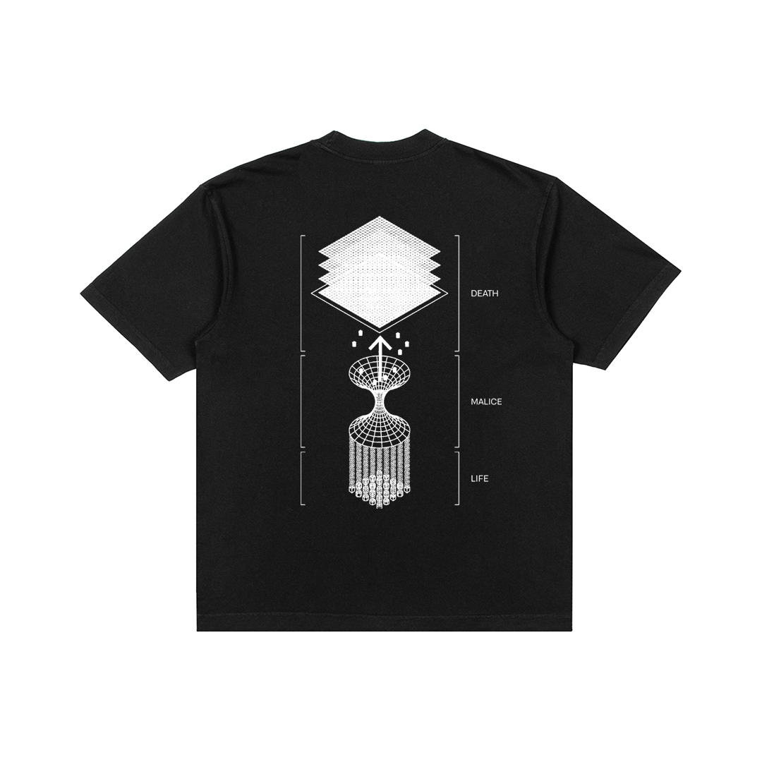 100% cotton t-shirt with "LAMENTING MALICE" graphics screen printed on the front and back.